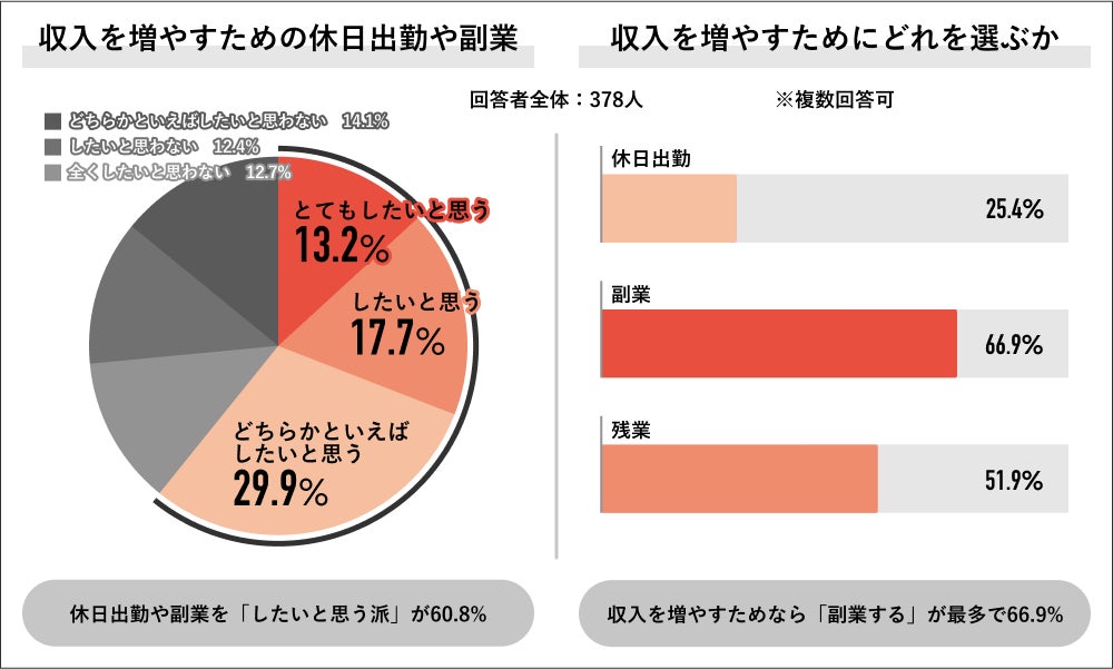 回答者全体の378人に収入を増やすための休日出勤や副業の意向を聞くと「したいと思う派」が60.8%と過半数を占め、内訳は「とてもしたいと思う」が13.2%、「したいと思う」が17.7%、「どちらかといえばしたいと思う」が29.9%となりました。また、収入が増えるならどれを希望するかを聞くと「副業」が66.9%で最多となり、「残業」が51.9%、「休日出勤」が25.4%となりました。