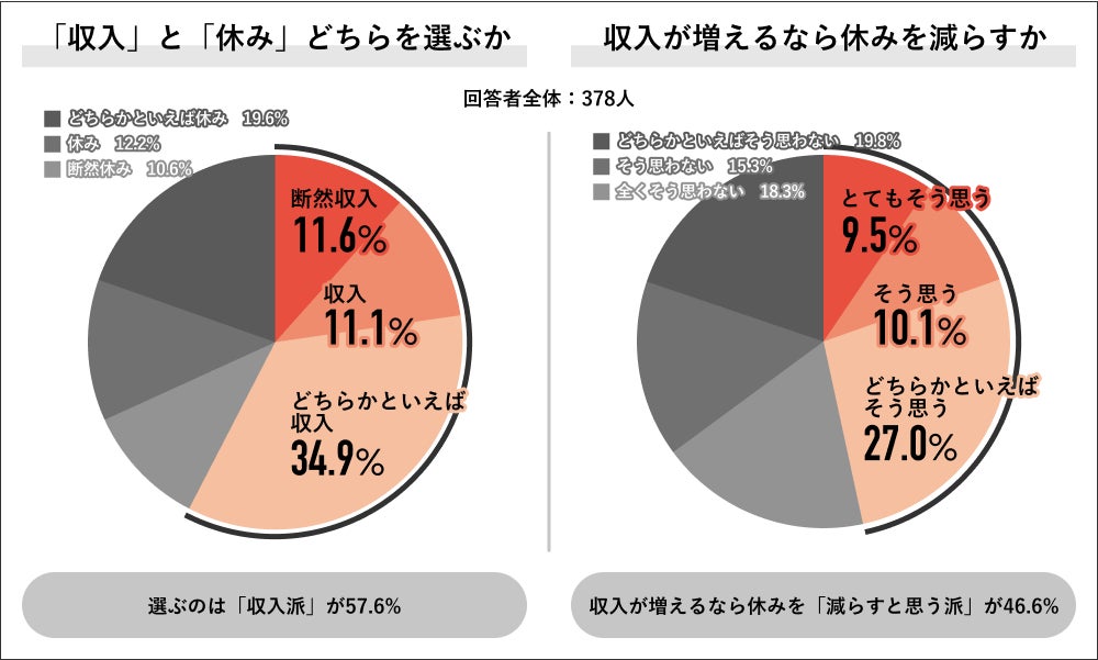 ・全体の57.6%が休みより「収入」を選ぶ 46.6%が収入が増えるなら「休みを減らす」