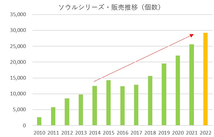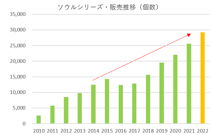 当社では、「ソウルジュエリー」「ソウルプチポット」「ソウルステージ」の3ブランドからなる「ソウルシリーズ」約600種類を販売。累計販売個数は19万個を突破、2022年の販売実績はブランド設立当初の約12倍を記録しています。