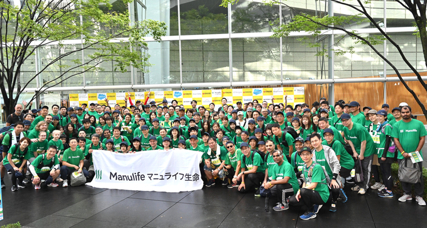 マニュライフ生命は、お客さまとそのご家族の将来の経済的な安心を支える生命保険会社として、「インパクト・アジェンダ」を社会貢献活動の中核としており、その柱の一つとして「持続的な心身の健康の増進」に取り組んでいます。当社は健康的なウォーキングを楽しみながらチャリティに参加するという大会の趣旨に共感し、東京ヤマソンにスポンサーとして協賛するとともに、社内で広く有志の参加チームを募りました。