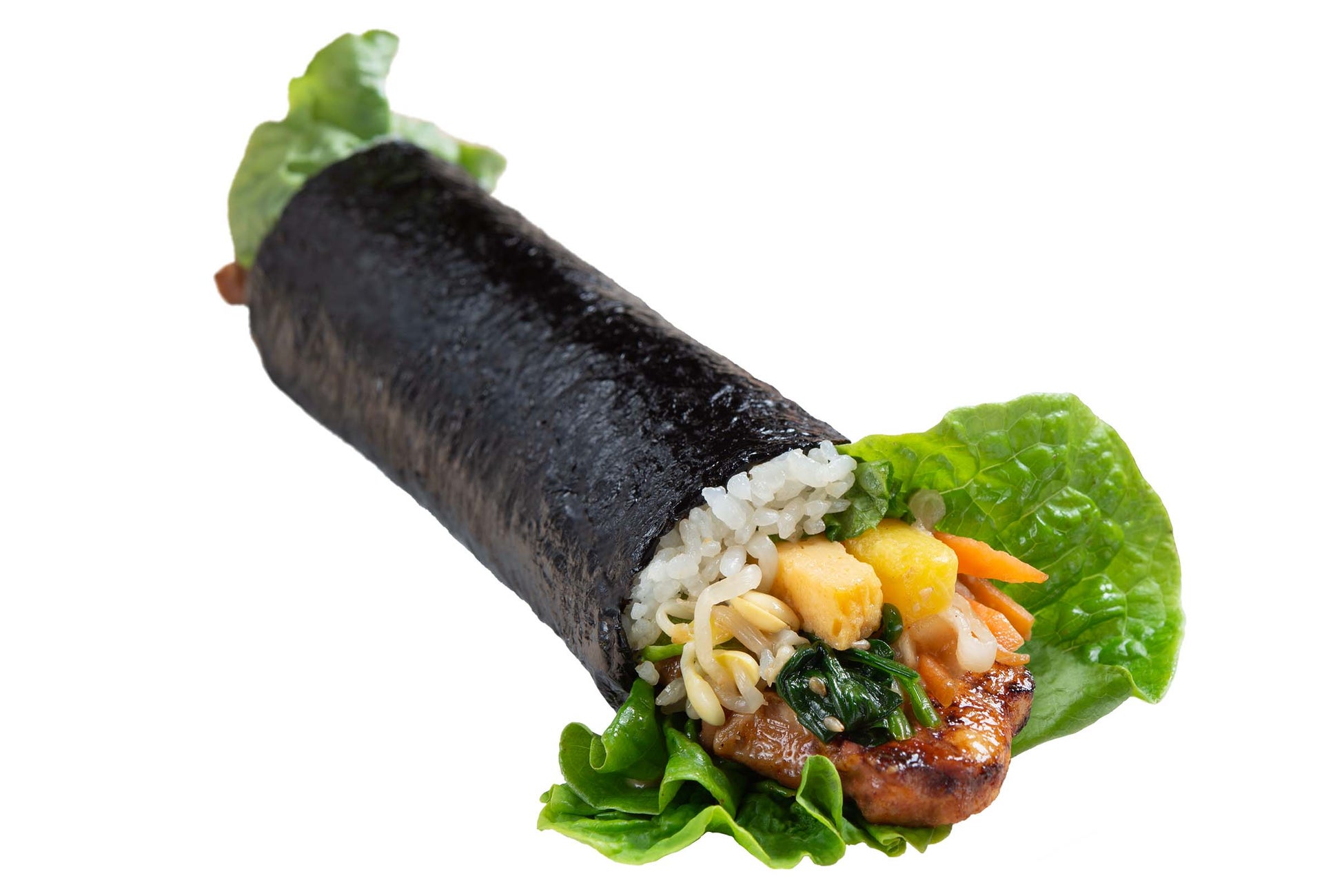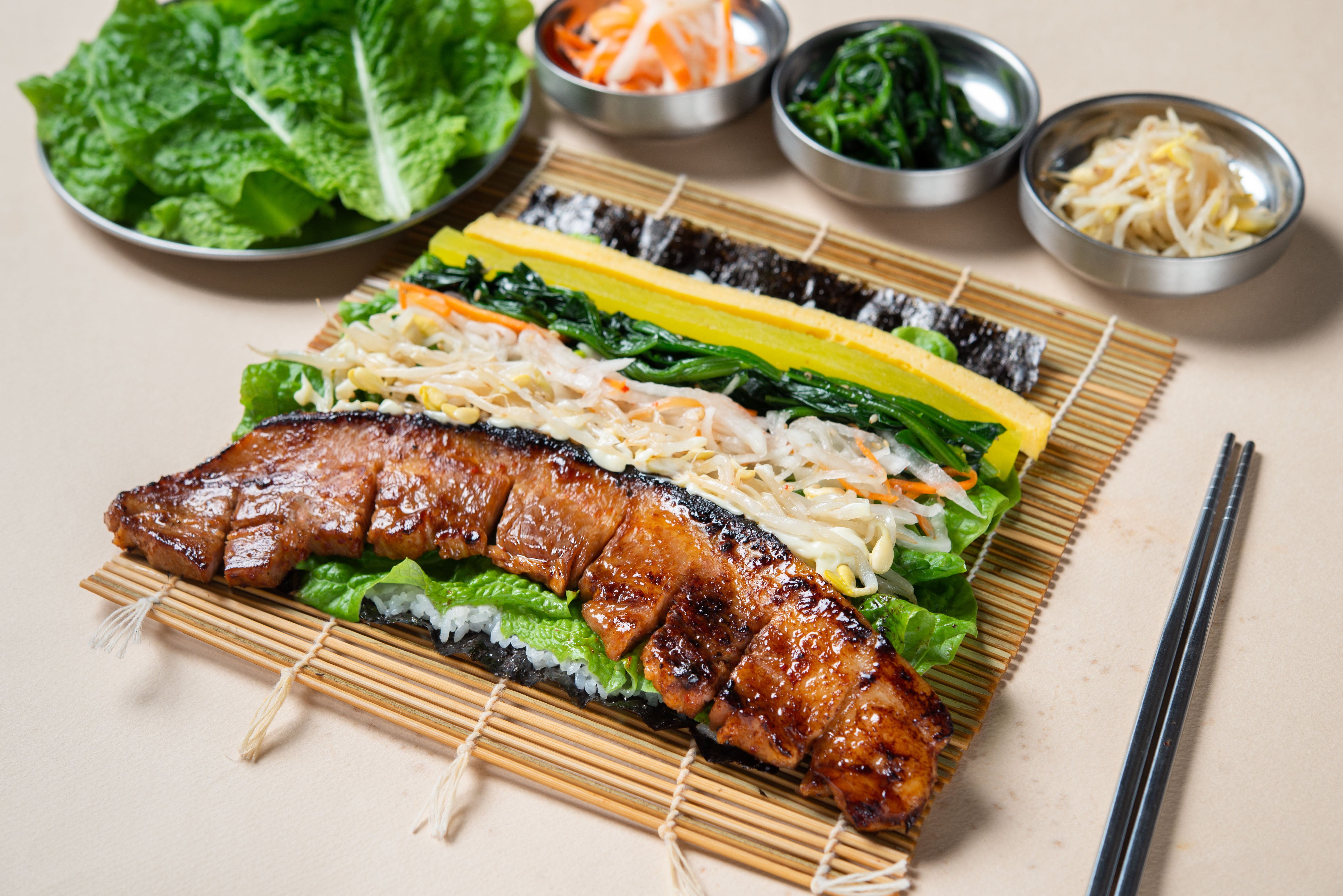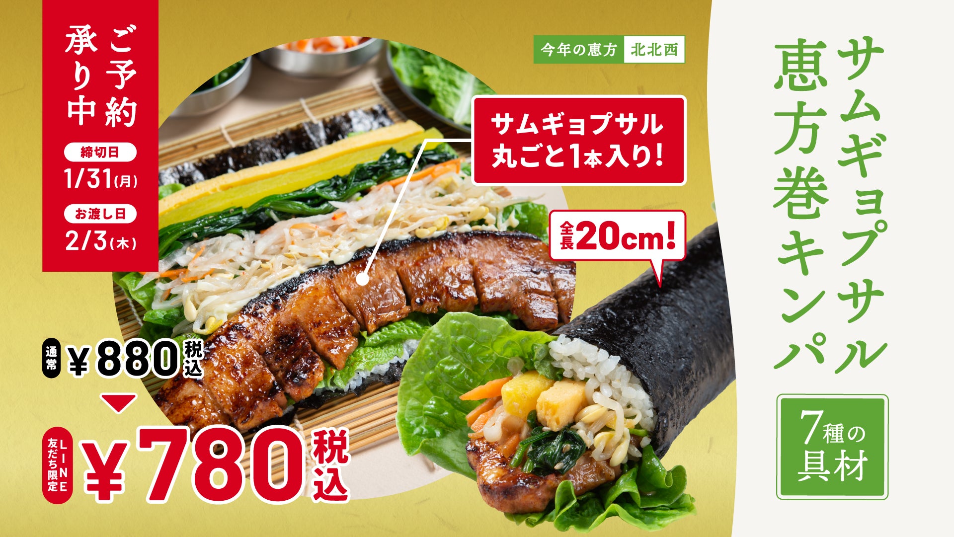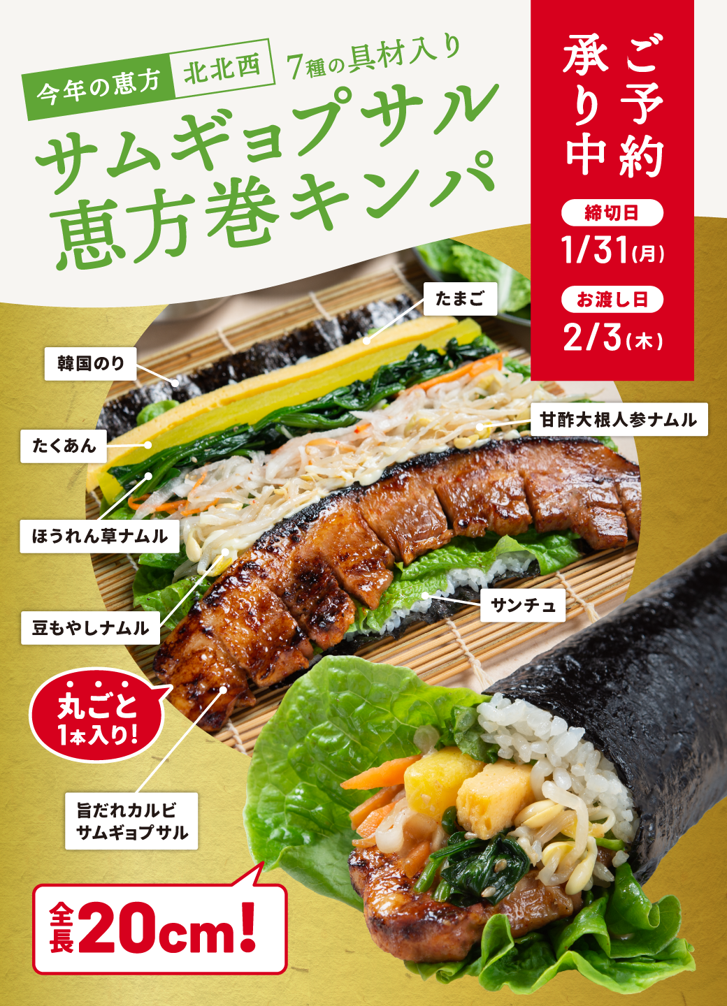 自家製の甘辛ダレに漬け込んだ「セン(生)サムギョプサル」を香ばしく焼き上げ、サンチュやナムルなど全7種の具材を韓国のりで巻いた特製のキンパ恵方巻きです。