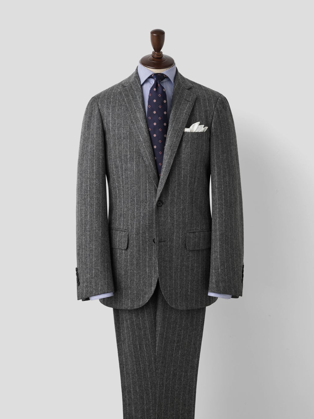 アメリカの老舗ブランドのスーツは、英国の名門フォックス ブラザーズのクラシックフランネル生地を採用し、日本のリングヂャケットで仕立てた一着。肩まわりの芯地を抜くことで丸みのあるショルダーラインを描き、軽やかな着心地にアップデートされている。
