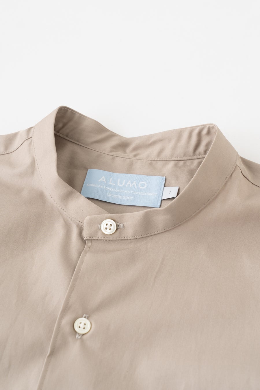 1918年創業のスイスの老舗シャツファブリックメーカーとして最高峰の素材を世界中のメゾンやテーラーに提供する ALUMO(アルモ)とGraphpaperのダブルネームによるバンドカラーシャツ。
