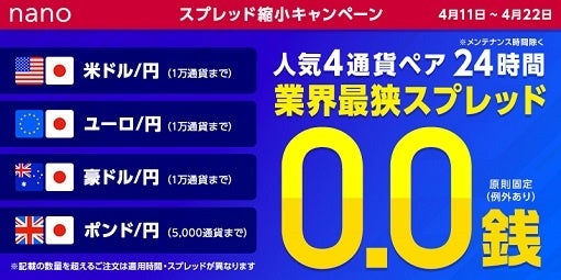 - 【nano】24時間主要4通貨ペアで業界最狭スプレッドを提示!