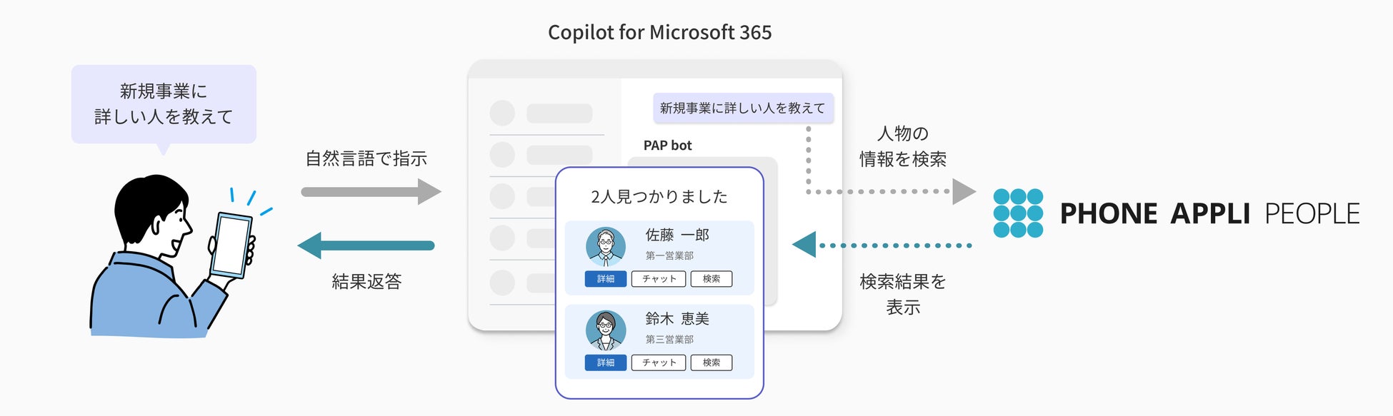 すべての企業をウェルビーイング企業にアップグレードすることを目指す、株式会社PHONE APPLI(本社:東京都港区、代表取締役社長:奥澤 慎哉 )は、PHONE APPLI PEOPLE bot プレビュー版(以下 PAP bot)においてCopilotプラグインを用いて、 Microsoft Copilot for Microsoft 365 (以下、Copilot for Microsoft 365 )との連携機能をリリースすることをお知らせします。これにより、様々なキーワードで社内の適切な人物を見つけ出し、コミュニケーションの円滑化を図ることが可能になります。