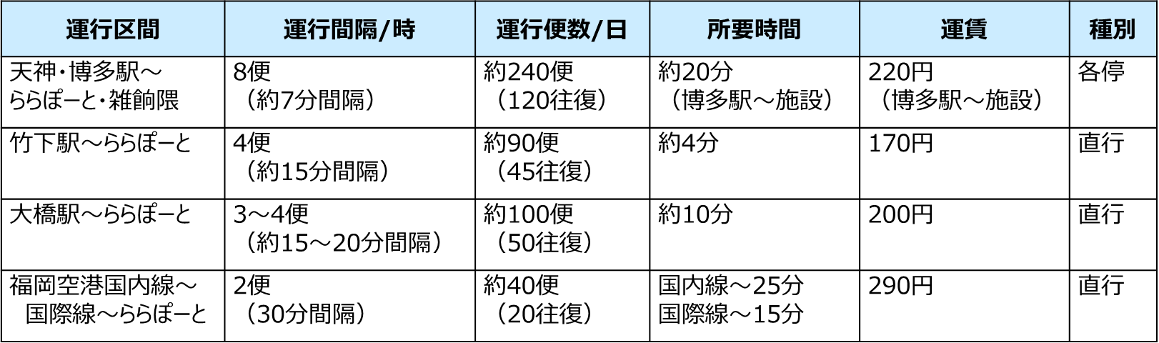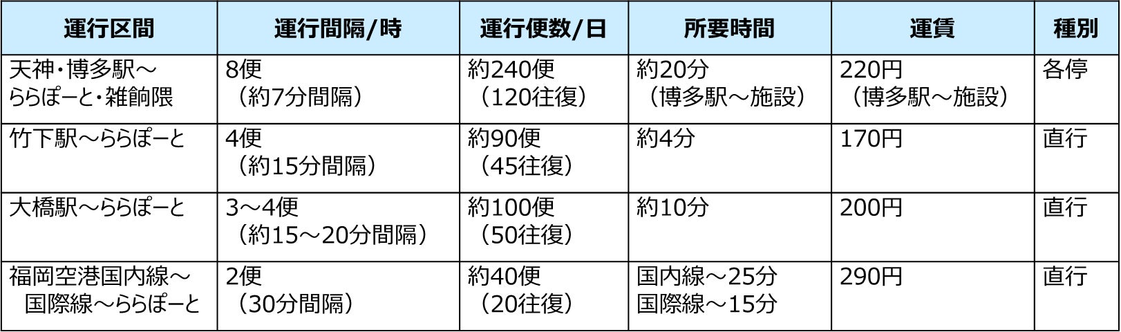 ・大橋駅から、ららぽーと福岡までの片道のみ利用可能。ららぽーと福岡発の便では利用不可。