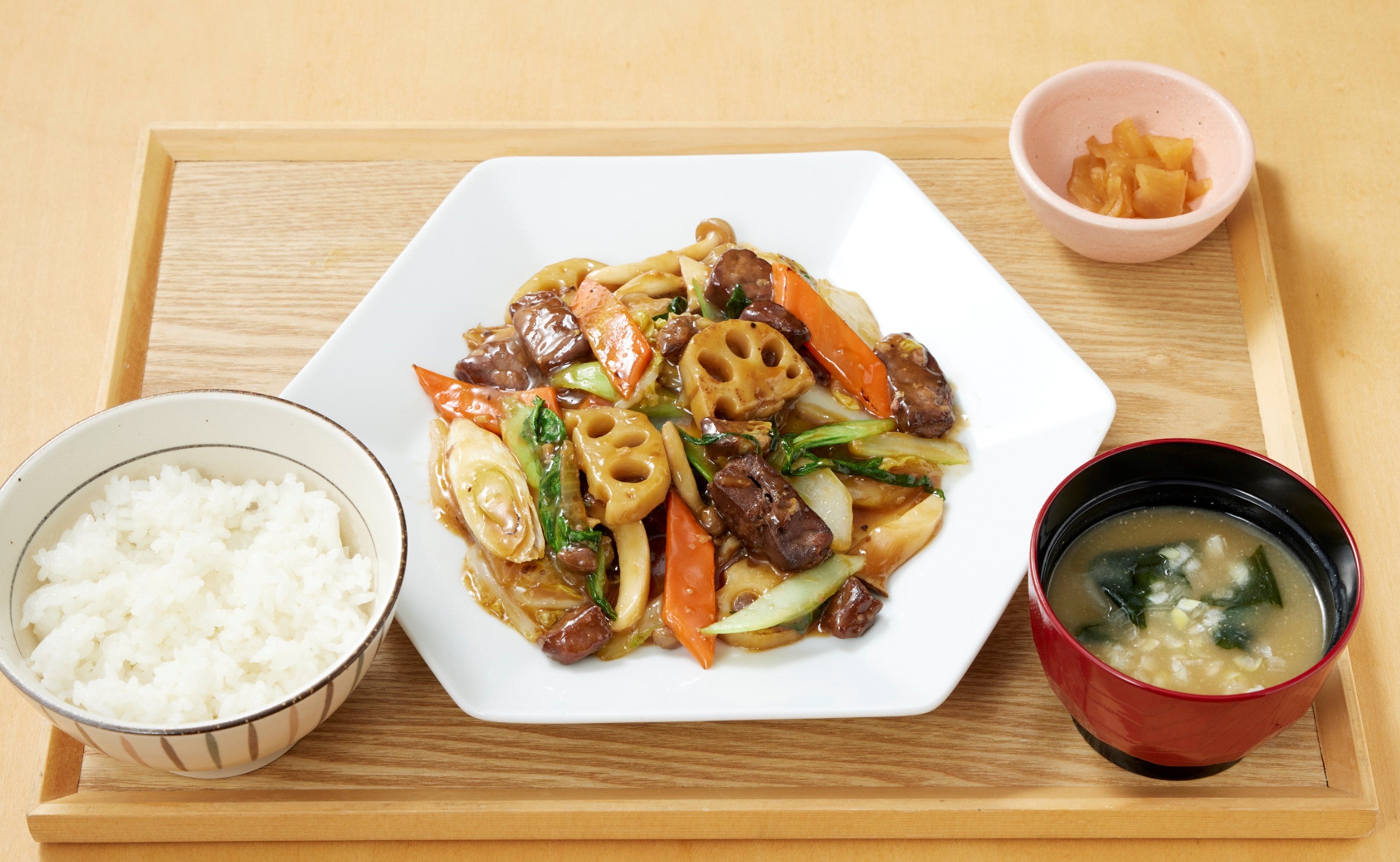 鶏レバーは、「栄養の宝庫」と呼ばれ、たんぱく質のアミノ酸バランスもよく、ビタミンAなどのビタミン、鉄や亜鉛などのミネラルを含む、健康を気遣う人にはおすすめの食材。レバーは臭みのあるイメージがありますが、醤油麹ダレのコクと、8種の野菜(白菜、長ネギ、チンゲンサイ、人参、れんこん、しめじ、エリンギ)の旨みで食べやすく深みのある味わいを楽しめます。気になる食物繊維もたっぷり摂ることができ、PFCバランス(たんぱく質、脂質、炭水化物)も健康を保つための理想的なバランスに近いメニューです。レバー特有の風味も少なく、炒める前に揚げるため食感も良い仕上がりです。