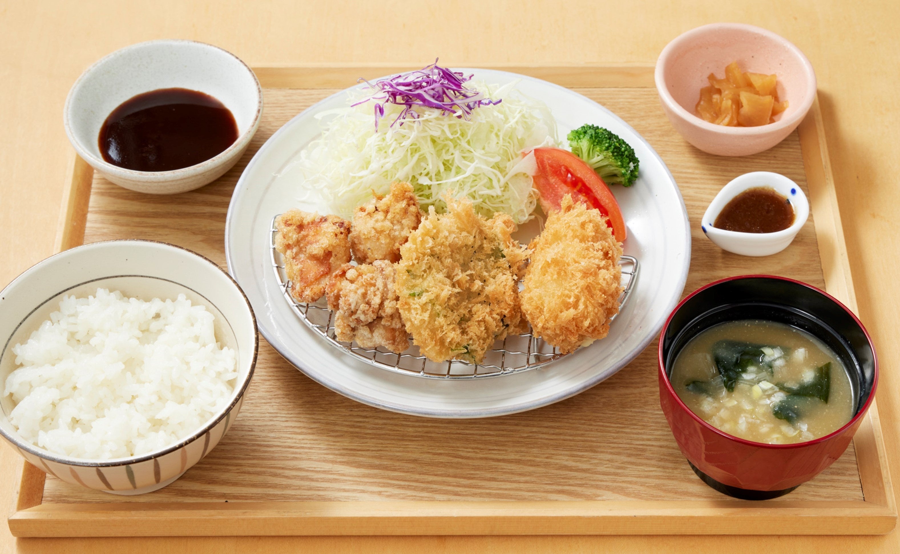 ホクホクの沖目鯛とじゃがいもが入ったサクふわコロッケと、香味唐揚げの合い盛り定食。コロッケは、軟骨入りの鶏つくねと大葉が入ったコロッケと、チーズの入ったコロッケで、2種の味と食感が楽しめます。 沖目鯛の脂質にはEPA(エイコサペンタエン酸)というオメガ3系に分類される不飽和脂肪酸が含まれています。この定食には健康効果の高いEPAのほか、日本人に不足しがちなカルシウムも含まれており、炭水化物、たんぱく質とともにバランスよく摂ることができます。
