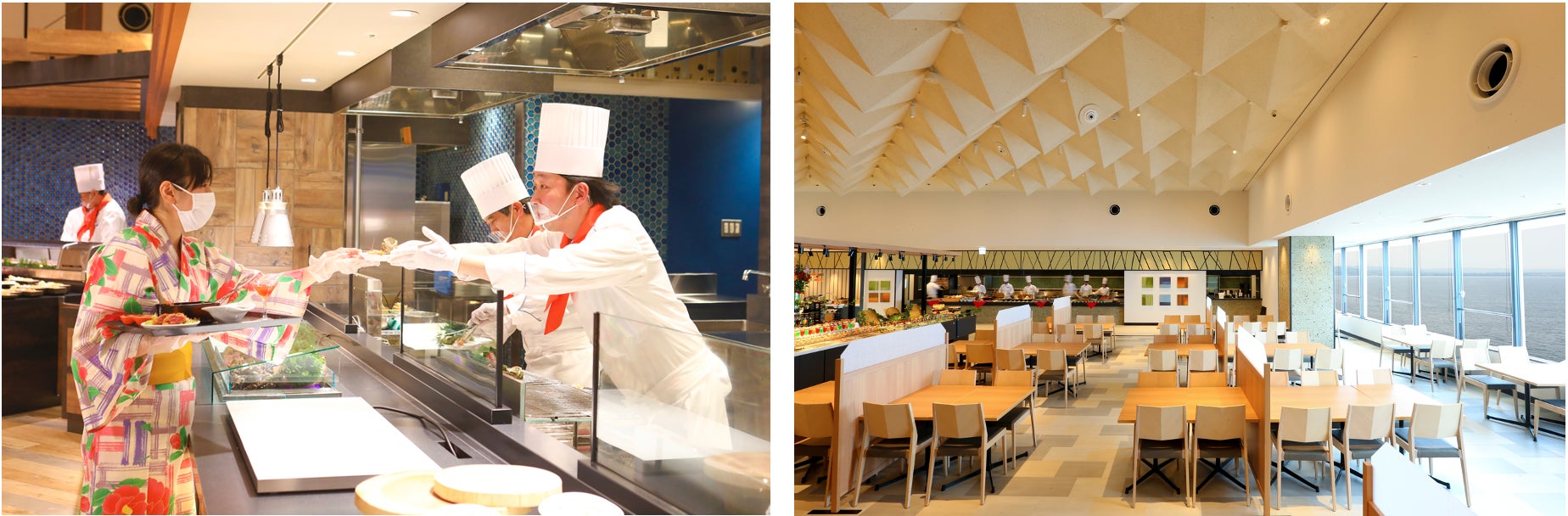 右:別府湾を望むレストラン。海を眺めながら、夜は新鮮な海鮮、朝は豊富なメニューが楽しめる開放的な雰囲気。季節や時間帯によっては、水平線から昇る朝日を眺めながら朝食を召し上がっていただけるのも魅力です。