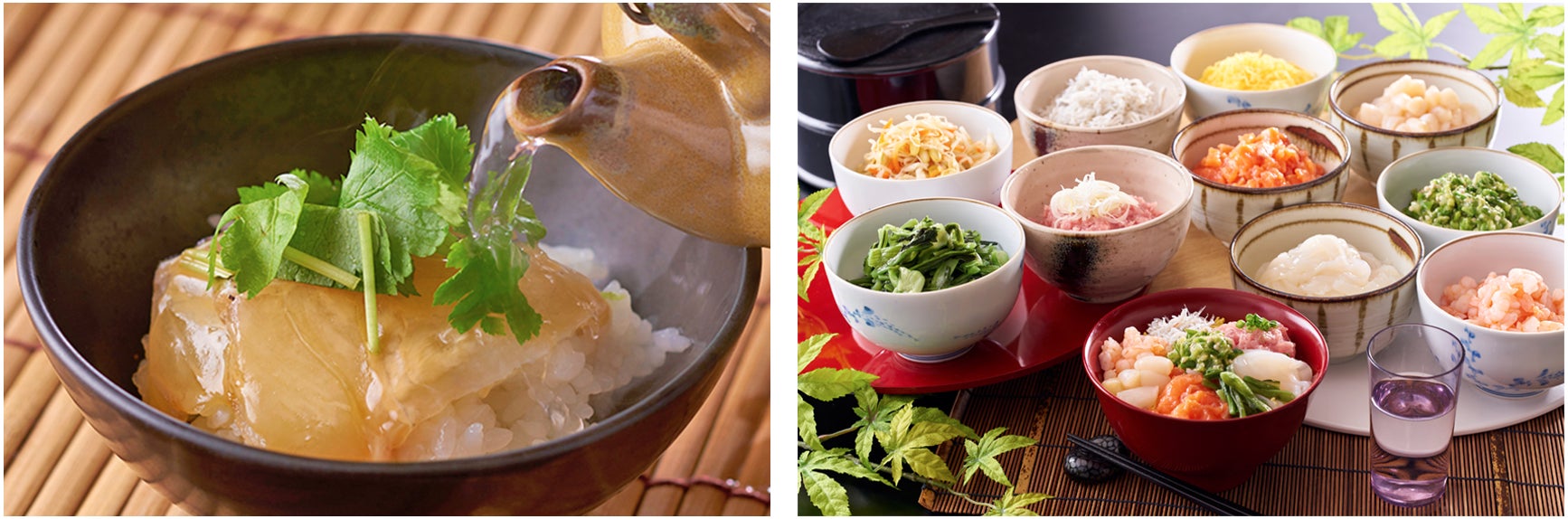 朝食の豪華さと充実ぶりも見逃せないあわらのバイキング。開業以来の一番人気、特製だれと上品な味わいの鯛で楽しむ「ごまだれ鯛茶漬け」、約10種類の具材をお好みで盛り付けて作る「のっけ丼」など、海の幸に恵まれた福井ならではの朝ごはんをお楽しみください。