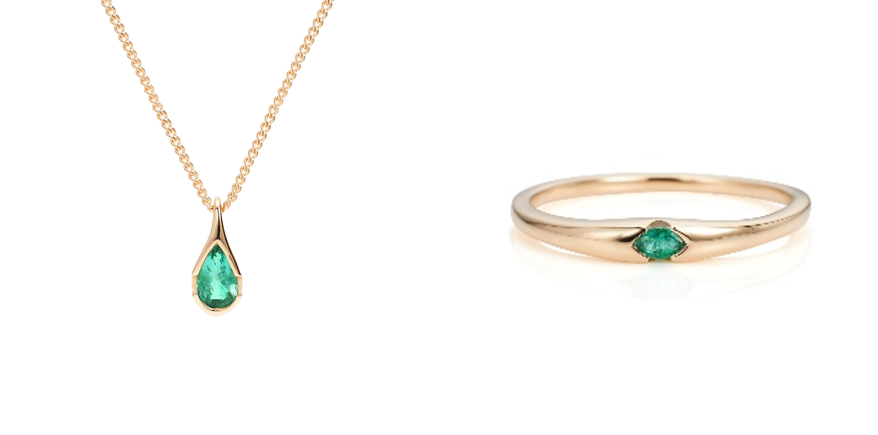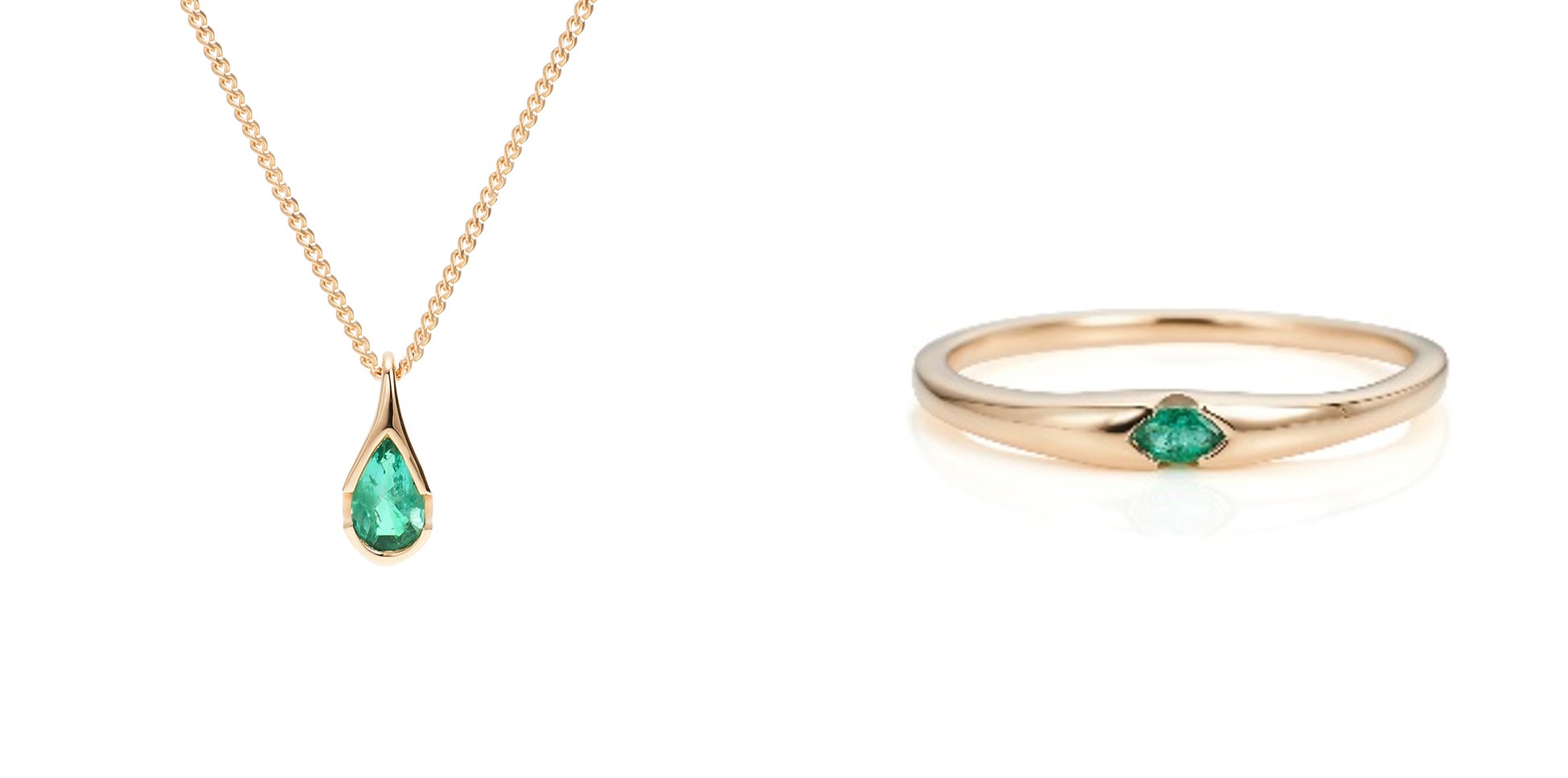 ■5月の誕生石「エメラルド」を留めたモダンジュエリー
