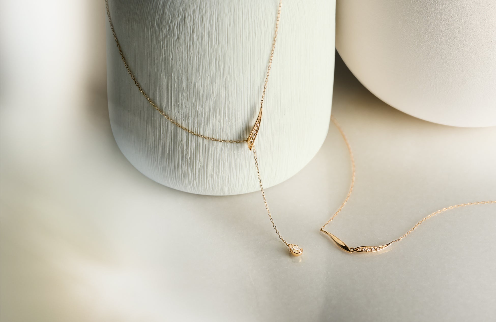 青々とした葉を象った地金のラインに、木漏れ日のように煌めくダイヤモンドが覗くジュエリーは、過去の4℃で代々愛されてきたアイテムから着想を得たデザイン。胸元に特別な輝きを添えるネックレスや、ノンホール派の方々にもお楽しみいただけるイヤーカフもご用意しました。