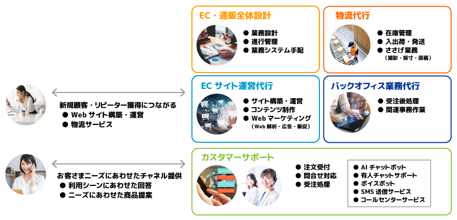 本提携では、ECサイト構築・運営から物流、請求、決済処理、問合せ対応、返品対応など、EC・通販に関連する業務において包括的に提供できるようになりました。これにより、在庫管理・品質・業務効率・コストなどEC・通販事業の運営・新規参入にかかる課題を解決し、さらにカスタマーサポート領域までをトータル提供することで、新規顧客とリピーター獲得だけでなくLTV(Life Time Value/顧客生涯価値)向上に向けた顧客コミュニケーションの強化を図り、EC・通販事業者様の売上を支えると共に、さらなる利益拡大に貢献いたします。