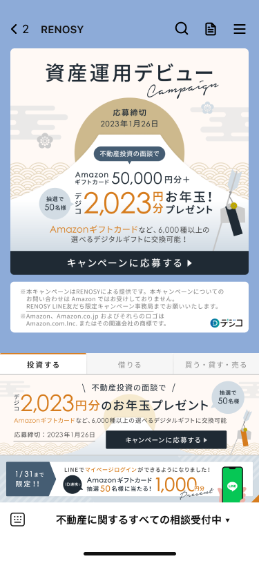・当選発表:賞品の当選発表は、2023年3⽉末頃にRENOSYのLINE公式アカウントで通知いたします。なお、発表までにLINEをブロックされますと当選無効となりますのでご注意ください。