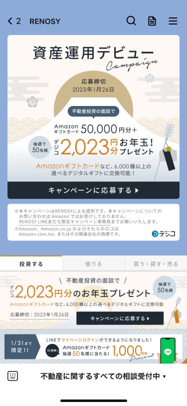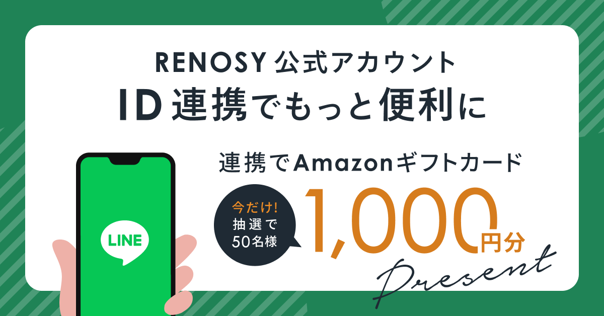 ネット不動産マーケットプレイス「RENOSY(リノシー)」を提供する株式会社GA technologies[GAテクノロジーズ](本社:東京都港区、代表取締役社⻑執⾏役員CEO:樋⼝⿓、証券コード:3491、以下「当社」)は、お客様の利便性向上を⽬的に、RENOSYのLINE公式アカウントとマイページの連携を開始しました。またこれを記念し、初めてのLINE ID連携でAmazonギフトカードが抽選で当たる「LINE ID連携キャンペーン」を実施します。