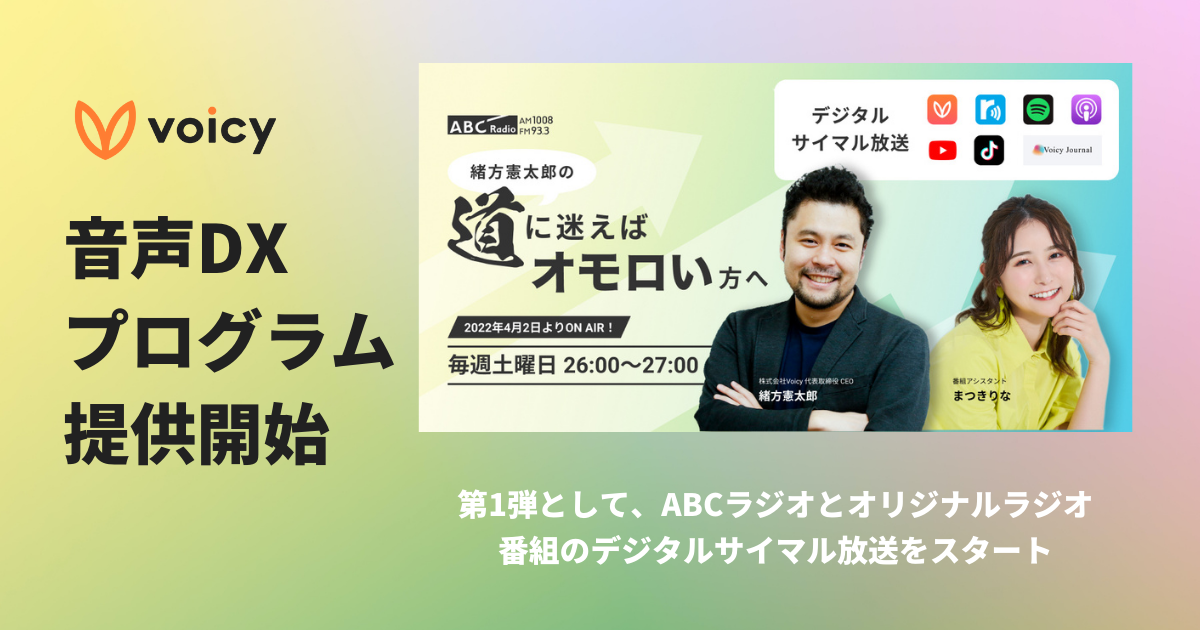 株式会社Voicy(本社:東京都渋谷区、代表取締役CEO:緒方憲太郎)は、音声ソリューション事業の一環として、「音声DXプログラム」の提供を開始します。あらゆる産業に音声をデジタルで導入することで、社会をリデザインしていきます。第1弾ではラジオのDXとして、朝日放送ラジオ株式会社(本社:大阪府大阪市、代表取締役社長:岩田潤)と連携し、「音声DXプログラム」を導入した新番組「緒方憲太郎の道に迷えばオモロい方へ」を制作、2022年4月2日(土)より放送開始します。