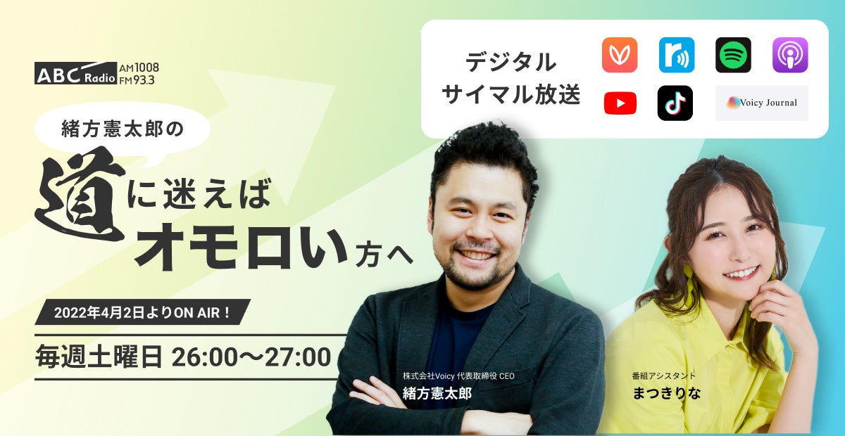 Voicy、「音声DXプログラム」を提供開始。第一弾としてABCラジオと連携し、ラジオ番組「緒方憲太郎の道に迷えばオモロい方へ」のデジタルサイマル放送をスタート。