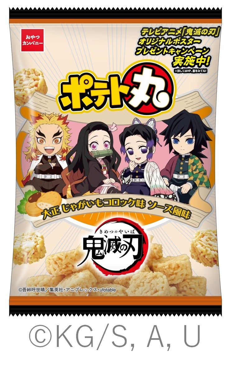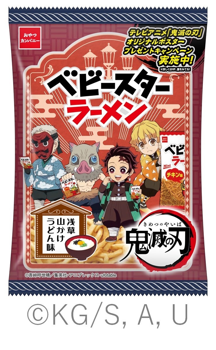 株式会社おやつカンパニー(本社所在地:三重県津市 代表取締役社長:手島文雄)は、テレビアニメ『鬼滅の刃』パッケージの「鬼滅の刃 ベビースターラーメン(浅草 山かけうどん味)」、「鬼滅の刃 ポテト丸(大正 じゃがいもコロッケ味 ソース風味)」を2022年3月14日(月)より全国にて発売します。