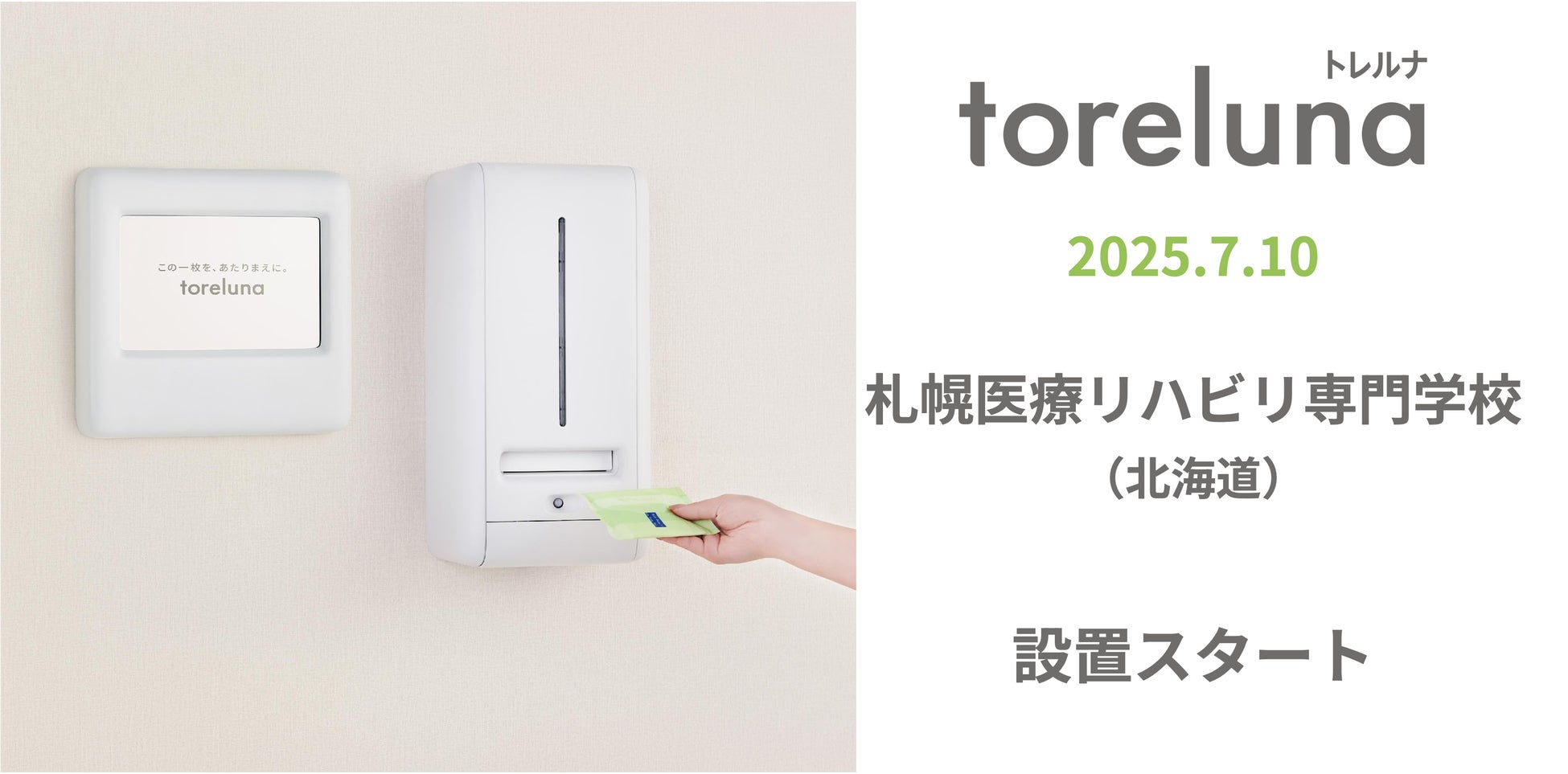 株式会社ネクイノ(大阪市北区、代表:石井 健一)は、トイレの個室で生理用ナプキンを常備し無料で提供するサービス「toreluna(トレルナ)」(以下 トレルナ)を、札幌医療リハビリ専門学校へ設置し、サービスの提供を開始いたしました。