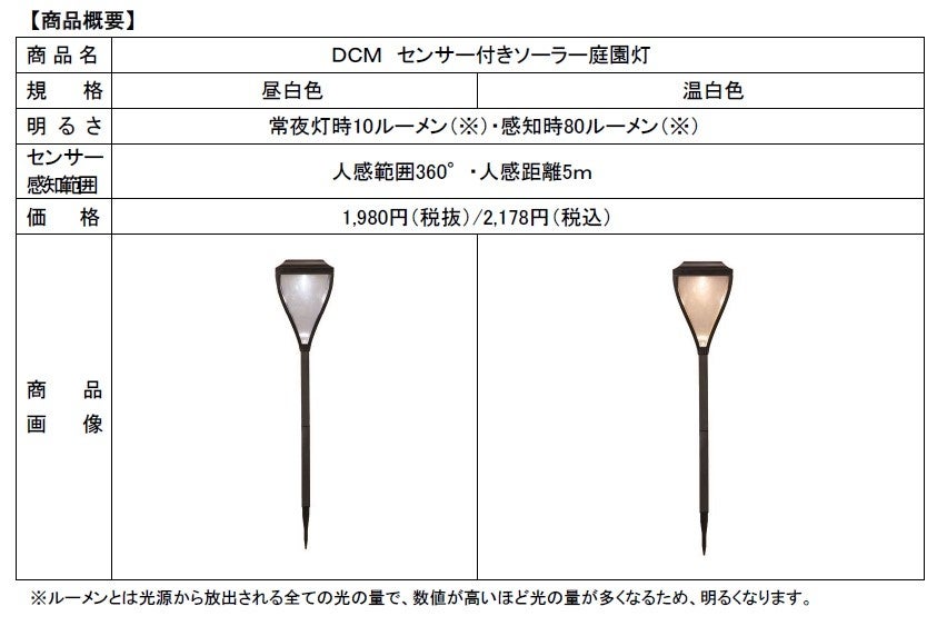 秋から冬に向けて、日が短くなる季節の防犯対策として「DCM センサー付きソーラー庭園灯」新発売