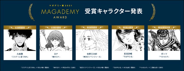 「マガデミー賞 2021」では、<主演男優賞>に『ミステリと言う勿れ』より久能 整さん、<主演女優賞>に『暁のヨナ』よりヨナさん、<助演男優賞>に『東京卍リベンジャーズ』より佐野 万次郎さん、<助演女優賞>に『ちはやふる』より若宮 詩暢さん、そして<審査員特別賞>に『ベルセルク』よりガッツさん、以上5名の受賞が決定いたしました。