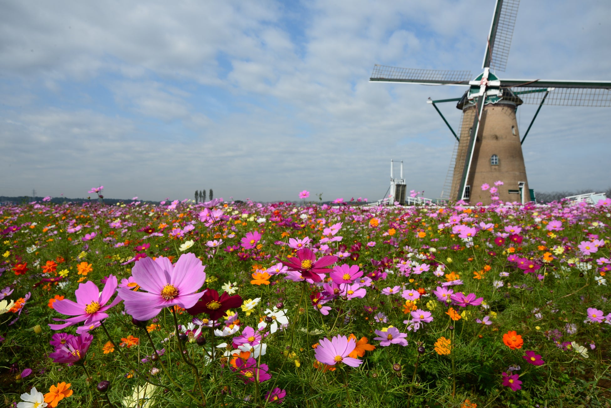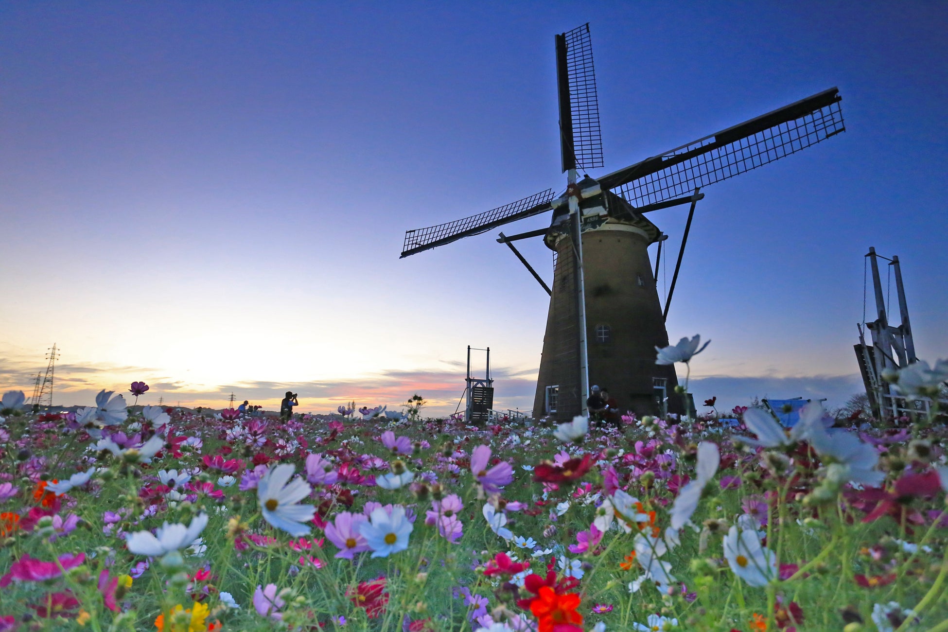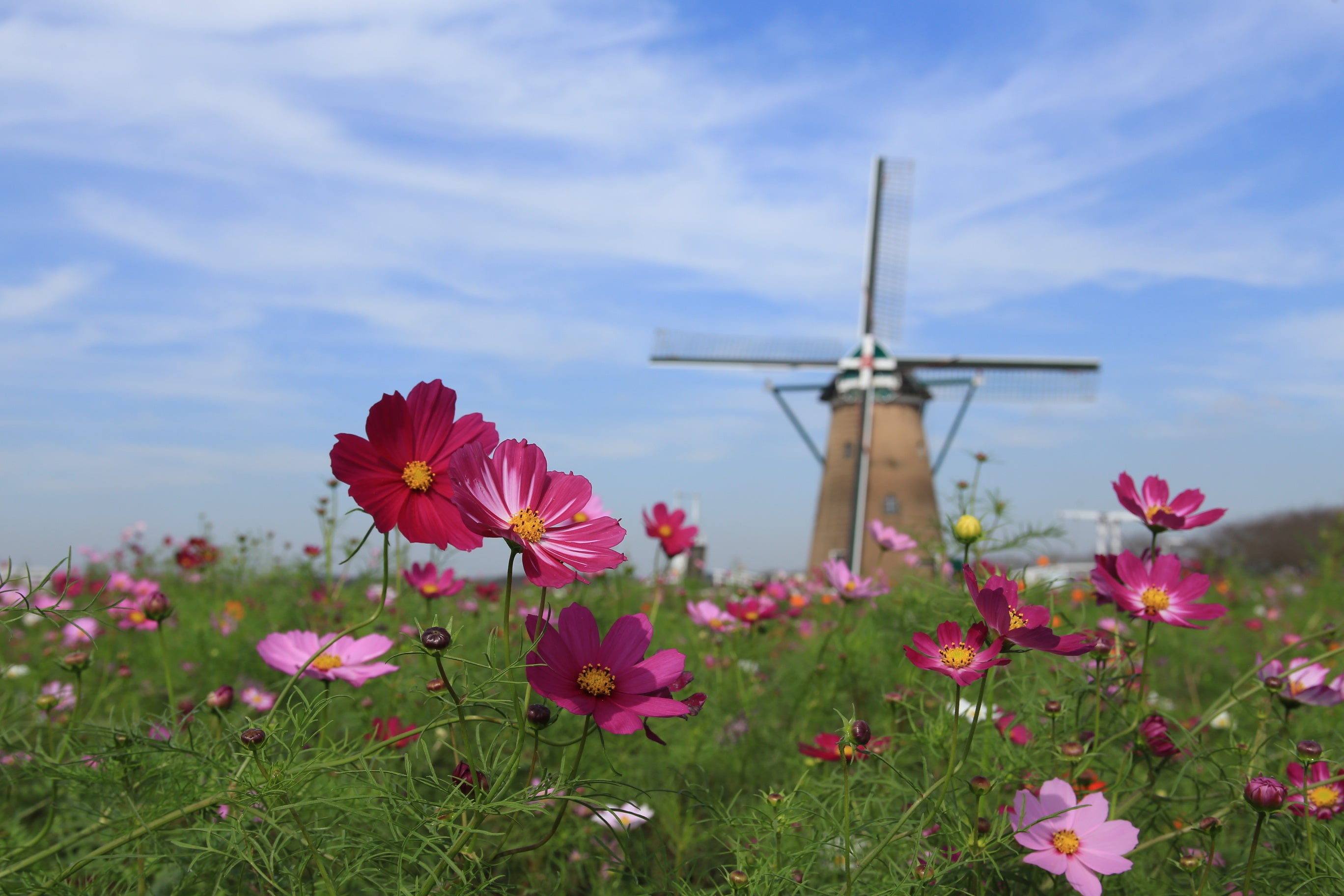 オランダ風車を背景に、辺り一面に広がるコスモス。青空と相まって素敵な情景が広がります。日中はもちろん、印旛沼に沈みゆく夕陽とともに、絶好のフォトスポットとなっています。