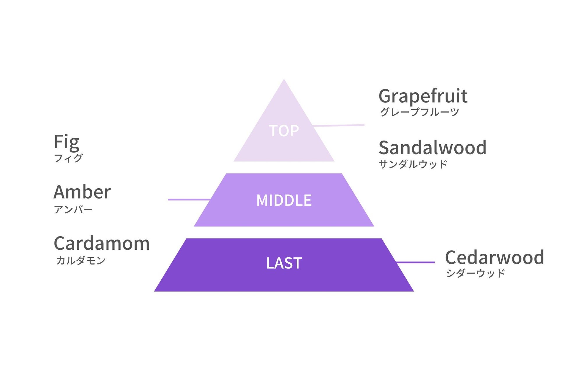 トップノートは、グレープフルーツのはじける爽やかさとサンダルウッドの落ち着き。そこに重なる、フィグとアンバーのやわらかな甘さと、シダーウッドの深みが幻想的な余韻を残します。月あかりような優しい、透明感のある”きよらかな香り”。