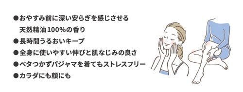 深い安らぎと爽やかさを感じさせる「スリーピーラベンダーの香り」の長時間保湿クリームが、うるおいを閉じ込めてしっかりキープしてくれます。