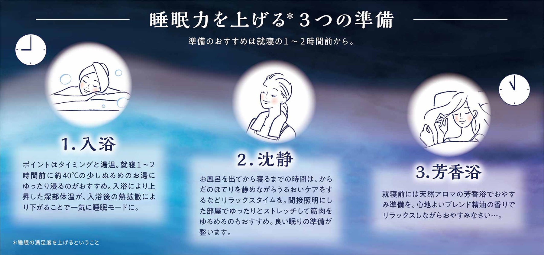 お風呂を出てから寝るまでの時間は、からだのほてりを静めながらうるおいケアをするなど、リラックスタイムを。