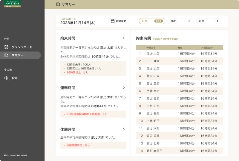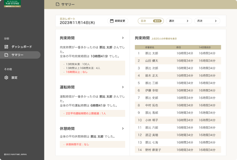 - 過去2週間の超過・不足:日ごとに法律基準に対しての超過や不足が発生した件数を折れ線グラフで表示。