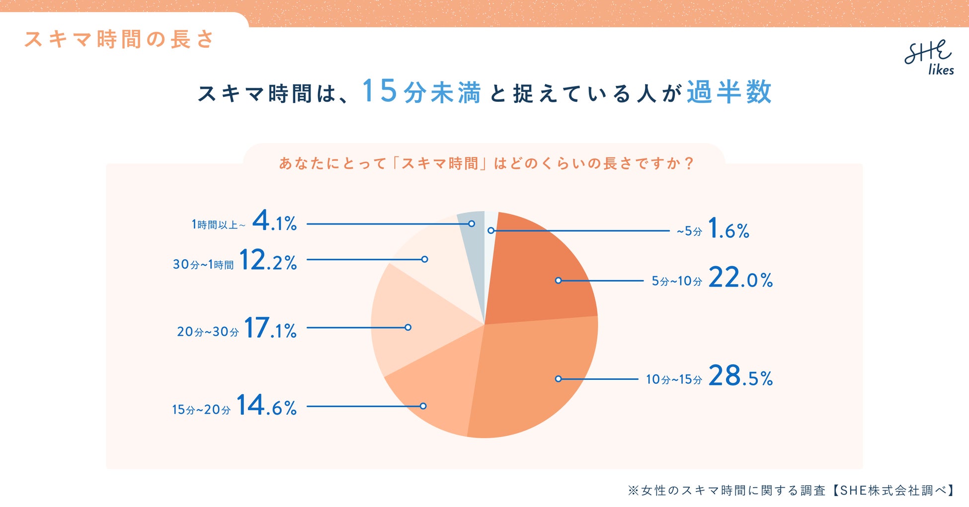 学ぶから働くまでをサポートする日本最大級の女性向けキャリアスクール「SHElikes(シーライクス)」を運営するSHE株式会社(所在地:東京都港区、代表取締役CEO:福田恵里、以下SHE)は、時間の使い方や環境が変化する新生活・新年度のタイミングに、タイパ時代の「女性のスキマ時間の関する調査」を、SHElikesで学ぶ女性を対象に実施しました。