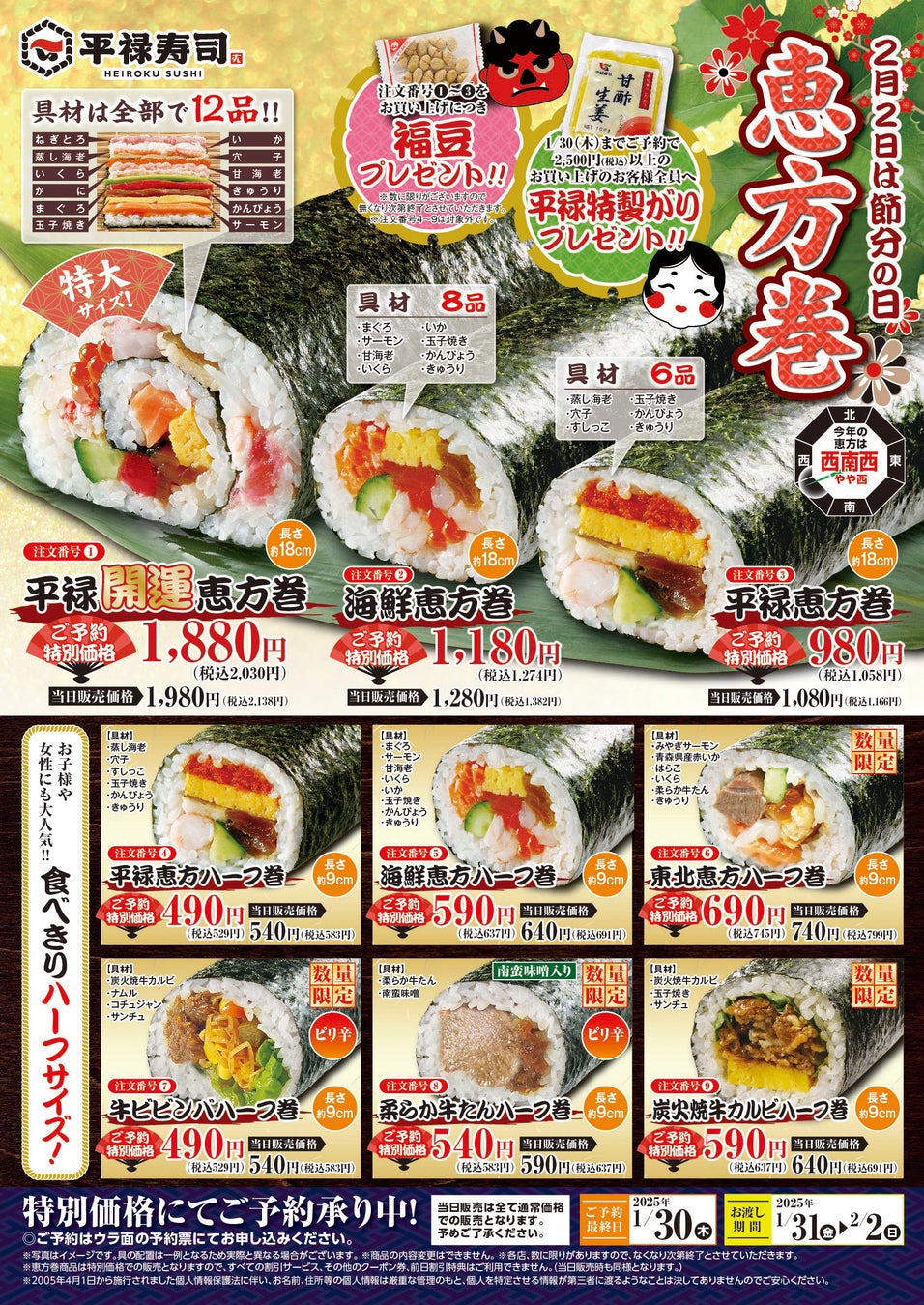 真心を込めてお寿司を握り続ける「平禄寿司」では節分の日に恒例となりました開運祈願の「恵方巻」を9種類ご用意いたしました。ねぎとろ、甘海老など12種類の具材を巻いた圧巻の特大サイズ「①平禄開運恵方巻」。サーモン、いくらなど8種類を巻いた「②海鮮恵方巻」。蒸し海老など6種類の具材を巻いた「③平禄恵方巻」にハーフサイズ(長さ約9cm)の「ハーフ巻」各種もご用意しております。どの「恵方巻」も1月30日(木)までのご予約で当日販売価格よりお得な価格にてご提供させていただいております。また、①②③の商品をご購入のお客様には「福豆」もプレゼントいたします。(数に限りがございますので無くなり次第終了。)令和7年も「美味しさ」と「開運祈願」、そしてお得感もお届けする平禄寿司の「恵方巻」。どうぞ、節分の日にお召し上がりください。