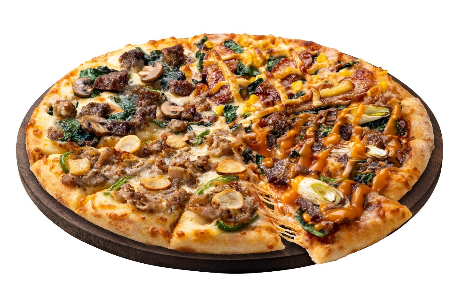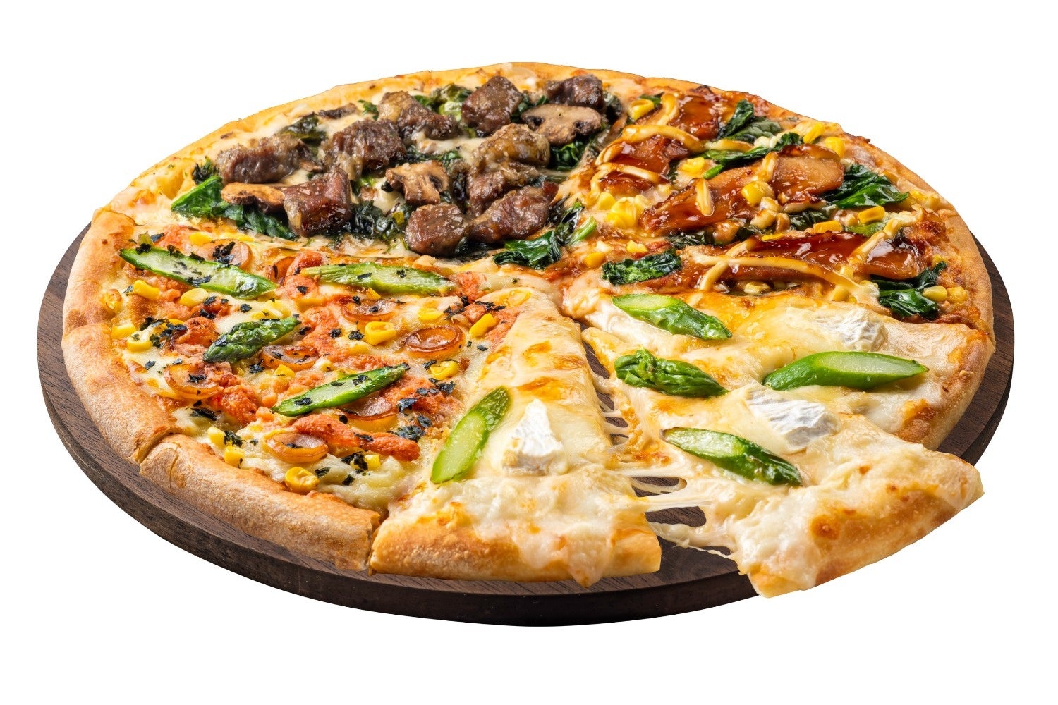 2023年3月6日から期間限定発売中の新商品です。日本人が大好きな和風お肉料理の代表格である「牛すき焼き」と「炭火焼肉」をピザにしました。「牛すき焼き」、「炭火焼塩豚カルビ」の2種の新商品と、定番で大人気の「炭火焼ビーフ」、「炭火焼チキテリ」の2種を、1枚に集め、4種の和の肉料理味わいを1枚のピザで楽しめる贅沢な一品です。