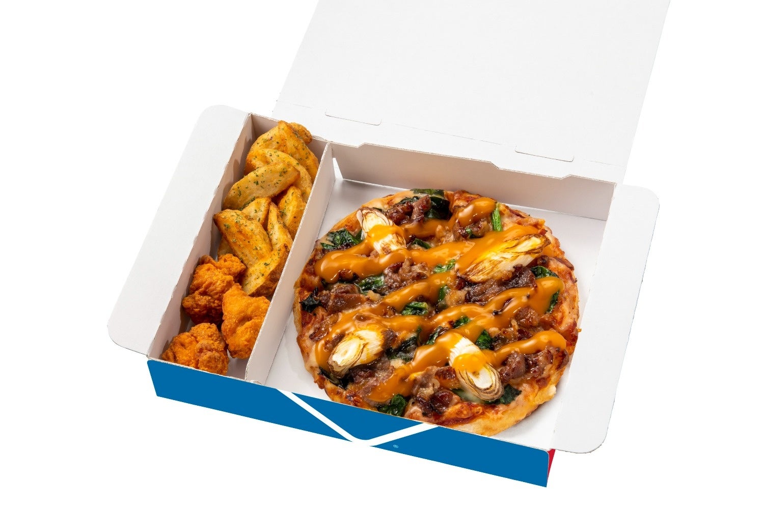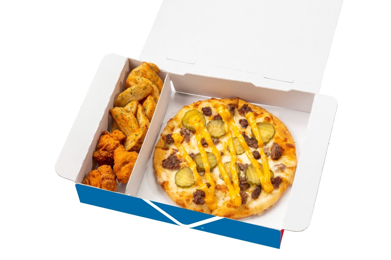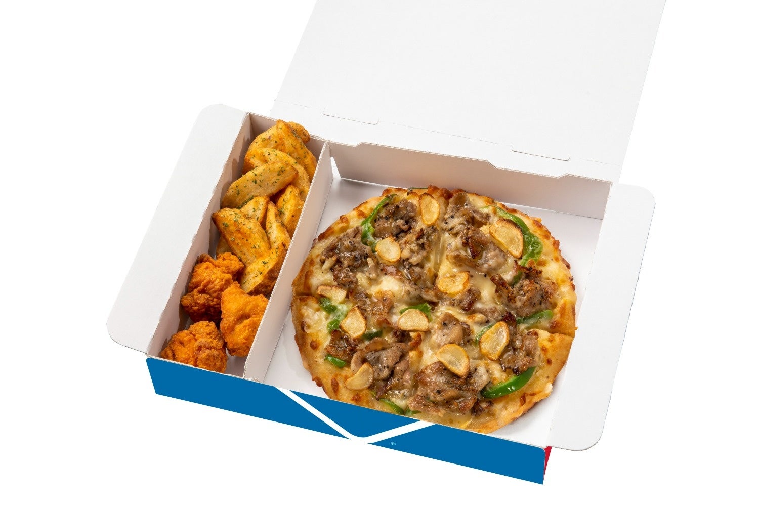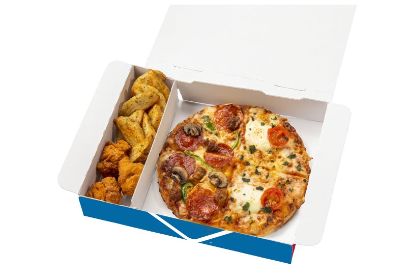 これなら、ワンボックスで、ピザとポテトフライ、からあげ(もしくは、フライドチキンやチキンナゲット)の最強セットが楽しめます。