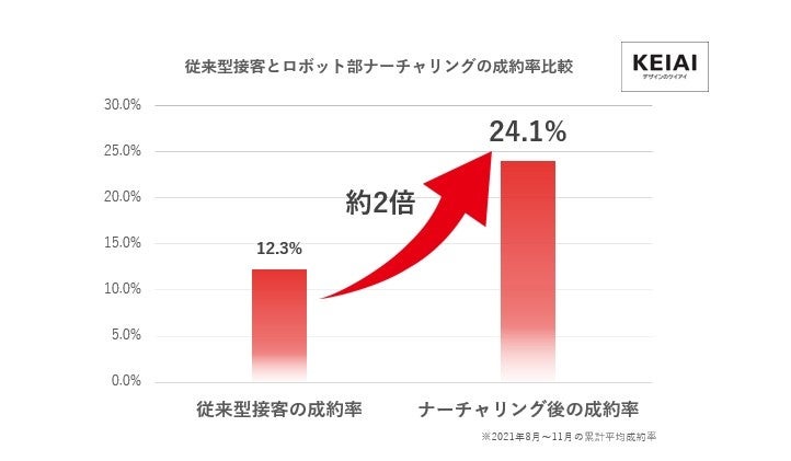ロボット部設立後の7月から11月までの5か月間でリモート接客回数は300回を超えました。ナーチャリングが進展し始めてからの8月から11月の4か月間において、ロボット部によるナーチャリング後のお客様の成約率は、同期間中の、初回来場時に営業担当者が展示場で対面で接客を行う従来型の接客の成約率との比較で約2倍であり、リモート接客によるナーチャリングの効果の高さを裏付けています。