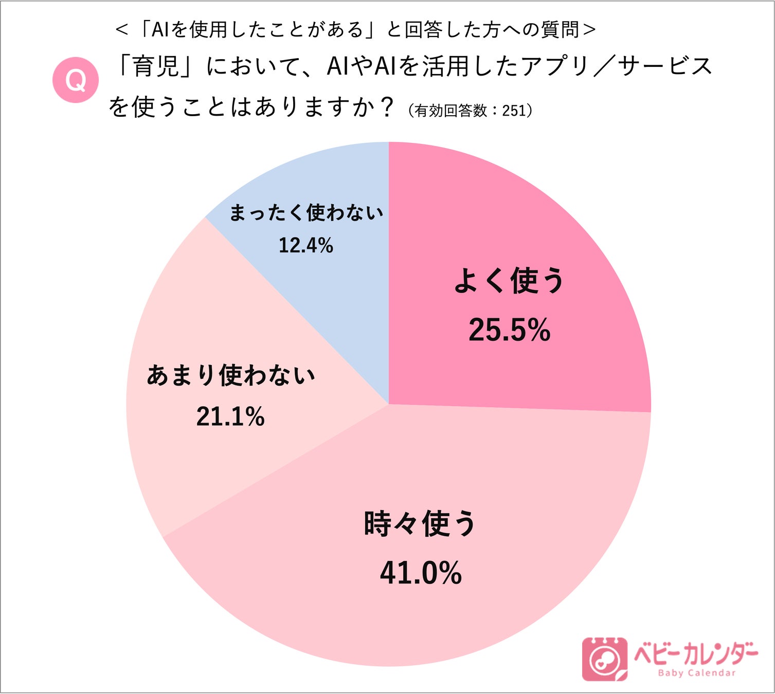 専門家から直接アドバイスを受けられる日本最大※の育児支援サイトを運営する株式会社ベビーカレンダー(旧社名:株式会社クックパッドベビー、本社:東京都渋谷区、代表取締役:安田啓司、以下「ベビーカレンダー」https://baby-calendar.jp/)は2025年5月、18歳未満の子どもをもつママ・パパ564名を対象に「子育てとAI活用」に関する実態調査を実施しました(調査期間:2025年5月23日~30日、インターネット調査)。その結果、全体の約4割が「育児にAIを活用している」と回答し、人に相談しづらい悩みや不安を“AIに話す”という新しい子育てのかたちが広がっていることが明らかに。その背景には、周囲に頼れずひとりで育児を抱え込む“孤育て”の実情が見えてきました。