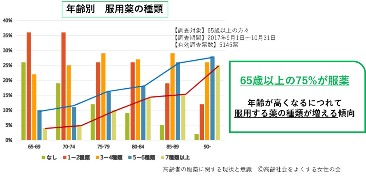 一方で、慢性疾患を複数抱える高齢者は増加しており、年齢が上がるにつれて薬の服薬率や服用する薬の種類が増える傾向がみられることから、薬の飲みすぎや飲み忘れ、飲み合わせなどの管理は重要な課題となっています。(NPO法人高齢社会を良くする女性の会)