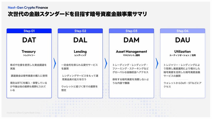 暗号資産市場の市場開拓は、自分自身で取捨選択し、資金・資産を利用・運用する時代へ急速に進んでいます。今までの暗号資産関連のプロジェクトの多くは市場が醸成されているものを経済的なメリットで強引に展開している状態でした。Neo Crypto Bank戦略は、資金調達(DAT)、レンディング(DAL)、資産運用(DAM)、活用(DAU)へと段階的に機能を拡張し、資金の調達・運用・活用を一連の流れで実現する構想です。