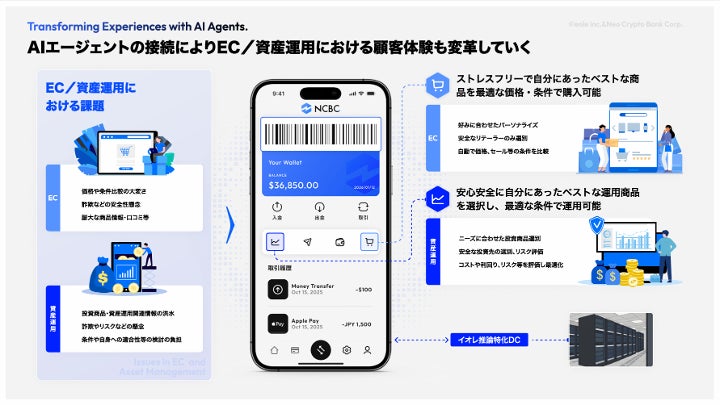 AIエージェントの接続によりEC/資産運用における顧客体験も変革をしていく見通しです。例えばストレスフリーで自分に合ったベストな商品を適切な価格・条件で購入が可能になったり、自分に合ったベストな運用商品を選択し、適切な条件で安全に最適な条件で運用が可能になります。