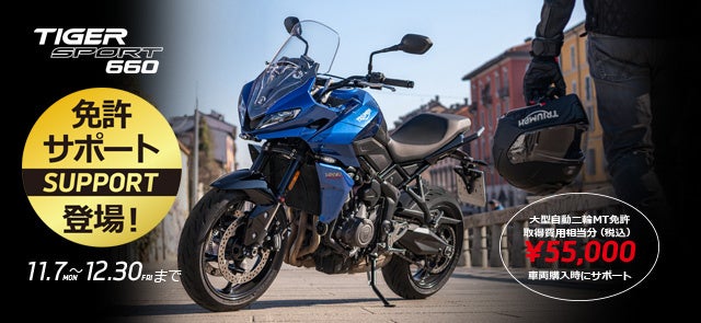 内容:期間中に対象モデルの新車をご成約・ご登録された方を対象に、以下の条件に該当する場合は、大型自動二輪MT免許取得費用相当分として5.5万円(税込)を車両購入時にサポートいたします。
