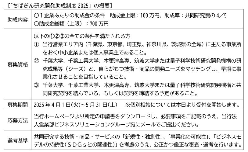 千葉銀行(頭取 米本 努)は、国立大学法人千葉大学、学校法人千葉工業大学、独立行政法人国立高等専門学校機構木更津工業高等専門学校、国立大学法人筑波大学および国立研究開発法人量子科学技術研究開発機構との連携により、中小企業向け助成制度「ちばぎん研究開発助成制度2025」の募集を行います。