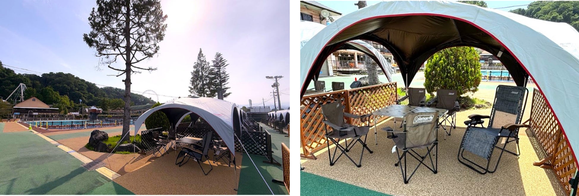 東京サマーランド内に、コールマンのキャンプギアを使った快適な休憩スペース「コールマンレスト」が登場します。大型のパーティーシェードライトの下にリゾートチェアを配置し、日差しを避けながらリラックスできるエリアを新設。プールで遊ぶ合間のひとときを、アウトドアギアならではの快適さでお過ごしいただけます。特に、ビーバーレイク付近の新設エリアでは、日光を90%以上ブロックし、温度上昇を軽減して涼しく過ごせるダークルームテクノロジーを搭載したパーティーシェードライト/300+を採用。来園されるお客様の暑さ対策として涼しい場所を提供します。