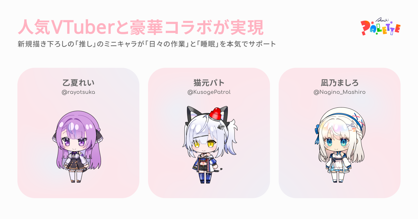 人気VTuberの乙夏れい、猫元パト、凪乃ましろとの豪華コラボが実現。仕事効率化×ヘルスケアアプリ「AWU: PALETTE」を2025年11月4日にリリース決定。予約注文・事前登録を開始