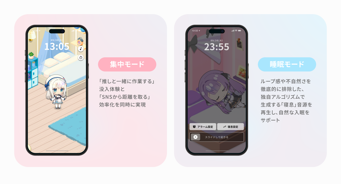 「推しと一緒に眠れる」体験を、安全かつ健全な形で提供。ループ感や不自然さを徹底的に排除した、独自アルゴリズムで生成する「寝息」音源を再生し、自然な入眠をサポートします。睡眠導入のサポートだけでなく、アラーム機能も搭載し、快適な目覚めを演出。