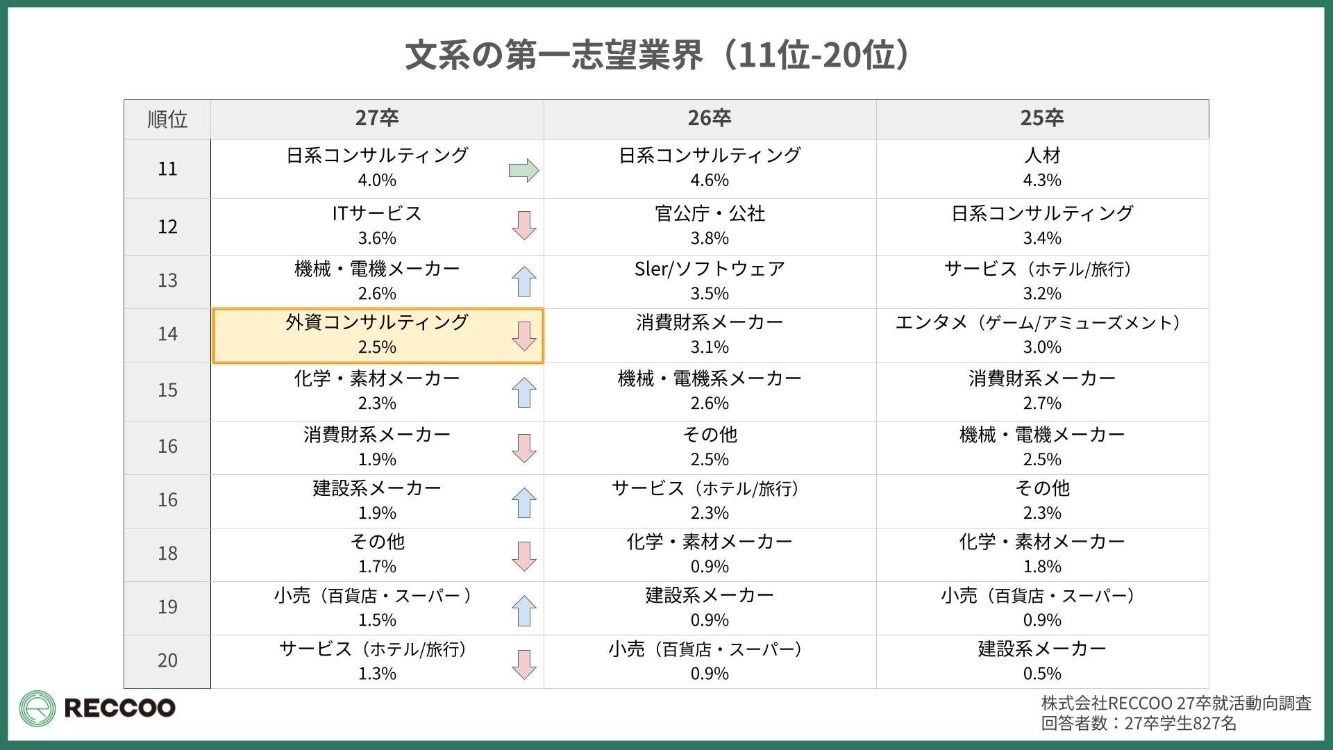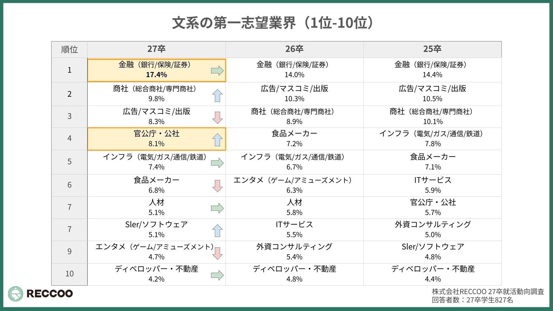 【文系優秀層】「金融」が不動の1位。一方で「官公庁」が急浮上し、「外資コンサル」は大幅下落