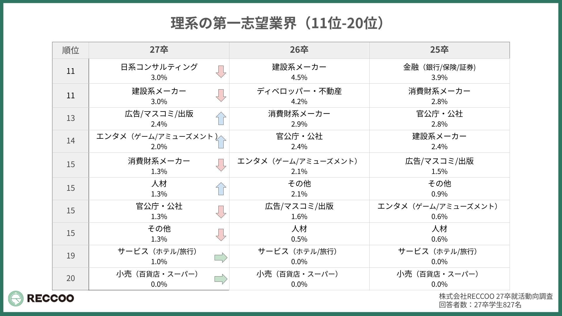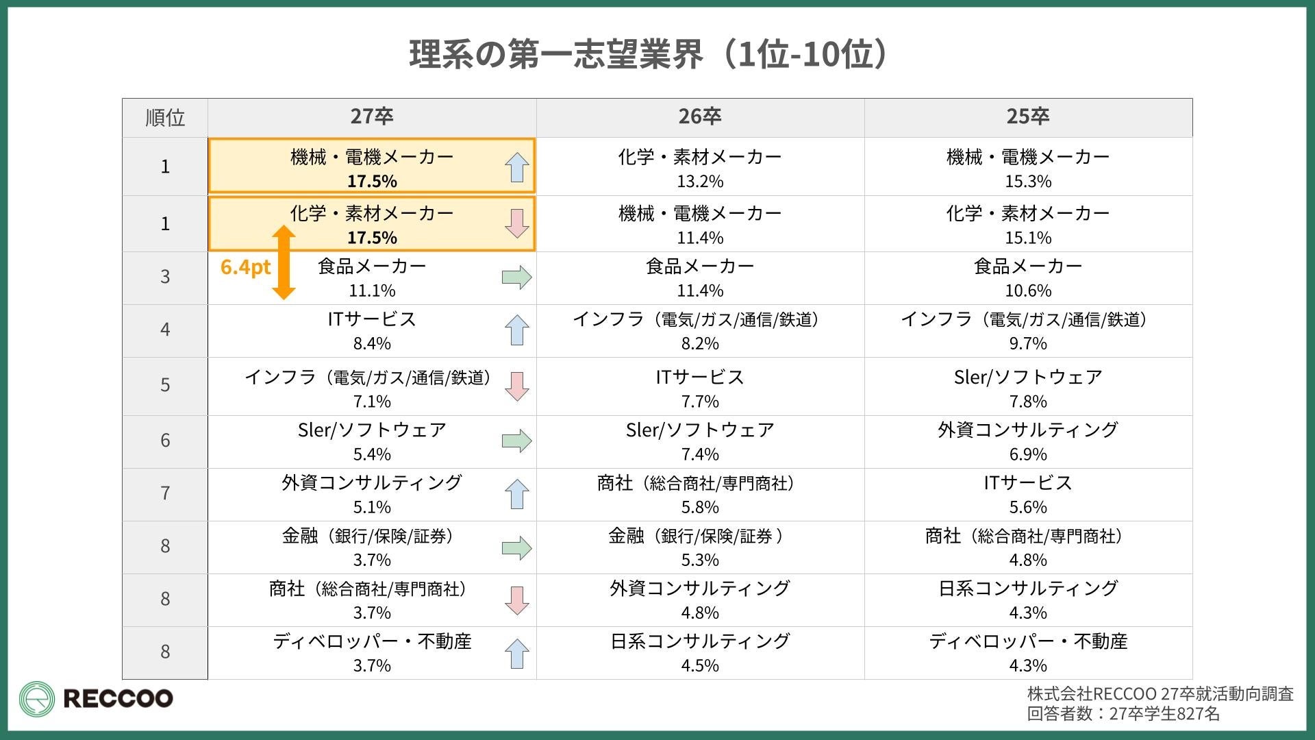 株式会社RECCOO(本社:東京都渋谷区、代表取締役 出谷昌裕)は、旧帝大・早慶・GMARCH等の上位校を中心とした2027年卒業予定学生827名を対象に「志望業界ランキング」を実施しました。本調査は、一般的なランキングでは見えにくい「優秀層」に特化した志向の変化を明らかにし、企業の戦略的な母集団形成を支援することを目的としています。