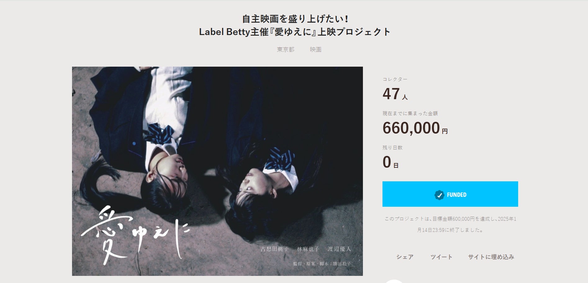 2024年11月から2025年1月にかけて、映画『愛ゆえに』の製作・配給費用を募るクラウドファンディングを実施しました。目標金額を上回る達成率110%を記録し、多くのご支援をいただくことができました。本作の上映に向けた期待の高まりを実感する結果となりました。