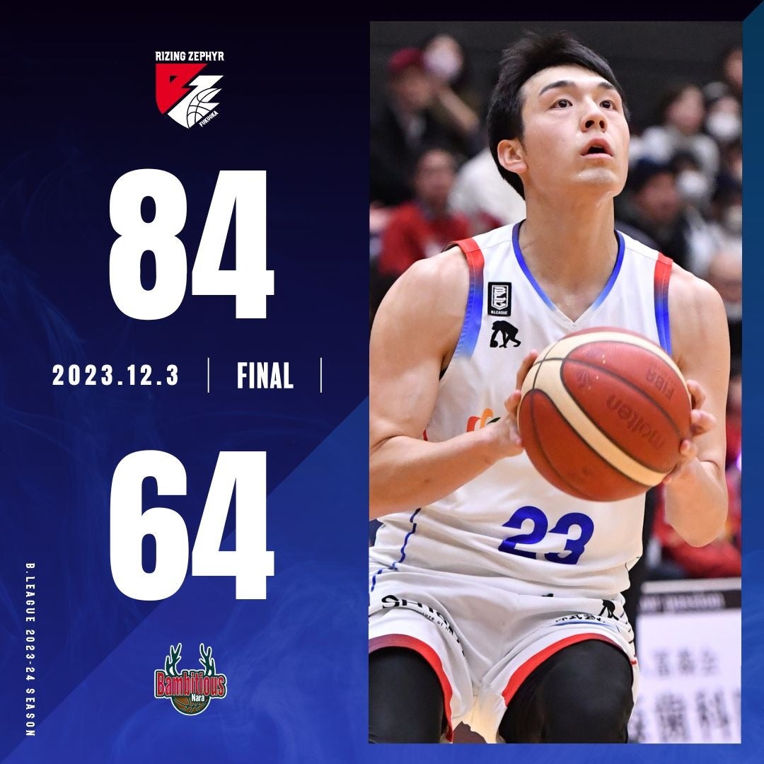 2023年12月3日(日)に開催されました【バンビシャス奈良vs.ライジングゼファーフクオカ】において“奈良64-84福岡”の結果となりましたことお知らせいたします。
