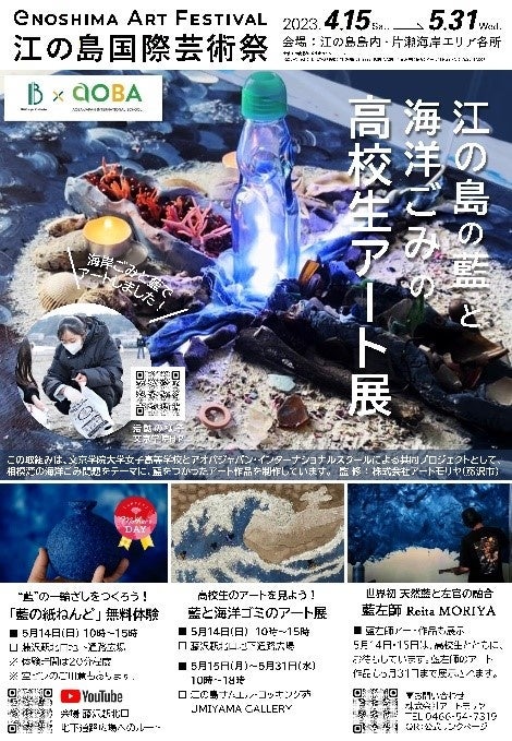 文京学院大学女子高等学校(校長:清水直樹)は、現在開催中の「江の島国際芸術祭2023」にて、藍左師・守谷玲太氏(株式会社アートモリヤ)監修のもと、相模湾の海洋ごみ問題をテーマに、アオバジャパン・インターナショナルスクールと共同制作した「藍」を使用したアート作品の展示(5/14~5/31)と、「藍の紙ねんど」ワークショップ(5/14)を実施することをお知らせします。