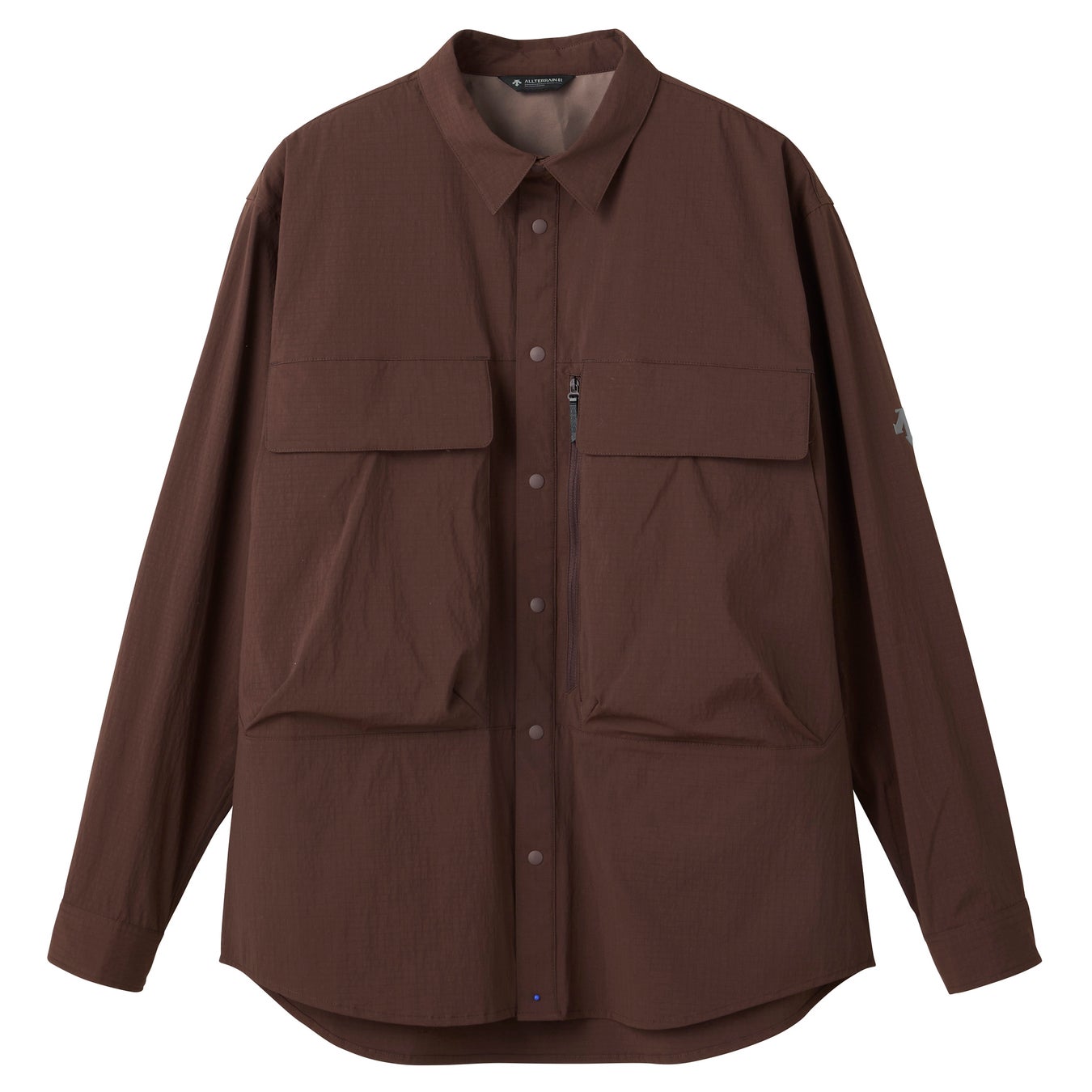素材はアウトドアユースにも適した、はっ水機能とストレッチ性を兼ね備えるコーデュラリップを使用。収納力と使いやすさを考慮したデザイン設計で、プラドットボタンで開閉する両胸フラップポケットに加えて、左胸のファスナーポケット内部には携帯電話等を収納するのに便利なモバイルポケットを内蔵。ややゆとりのあるシルエットで、軽量性も兼ね備え、重ね着にも最適なアイテムです。都市生活やアウトドアシーンでご活用いただけるシャツジャケットです。